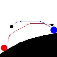 青君は下の赤君に、赤君し下の青君に全力で投げています。果たしてどちらが勝つでしょう?